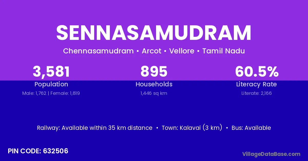 Kalavai (3 km) is the nearest town to Sennasamudram village for major economic activities and is located approximately 3 km away.