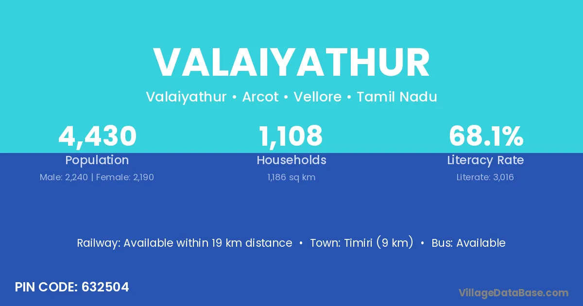 Timiri (9 km) is the nearest town to Valaiyathur village for major economic activities and is located approximately 9 km away.