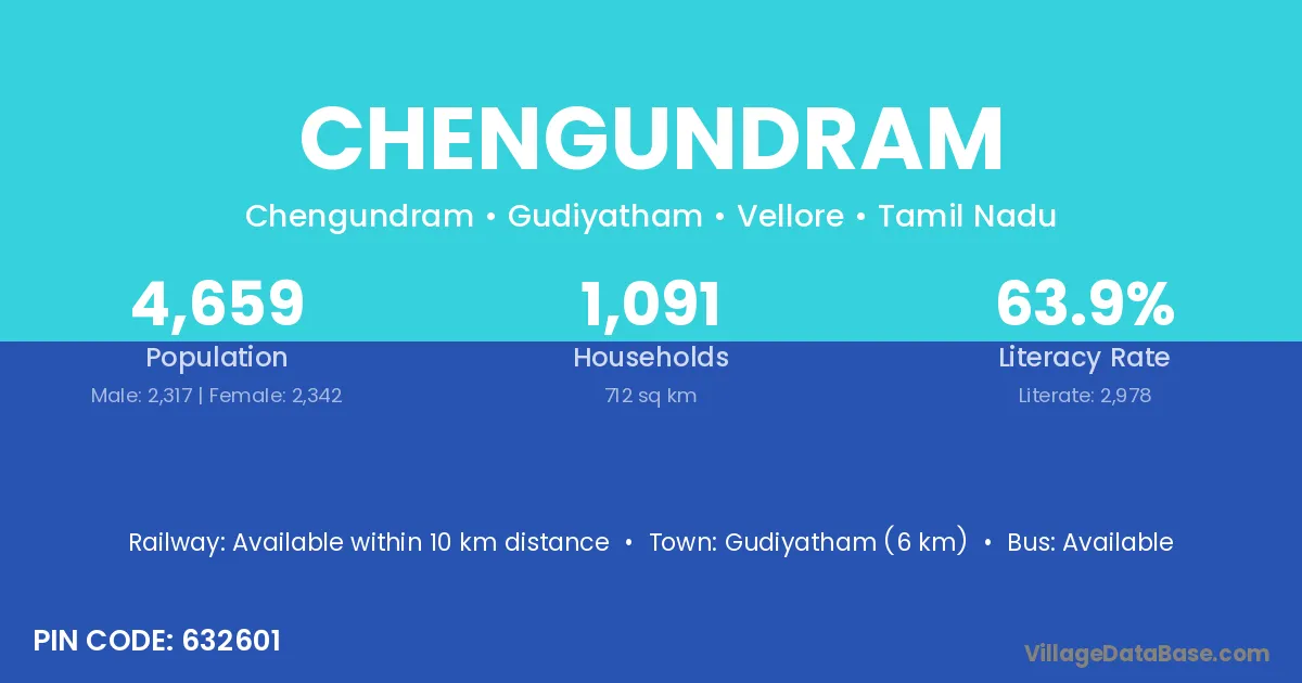 Gudiyatham (6 km) is the nearest town to Chengundram village for major economic activities and is located approximately 6 km away.