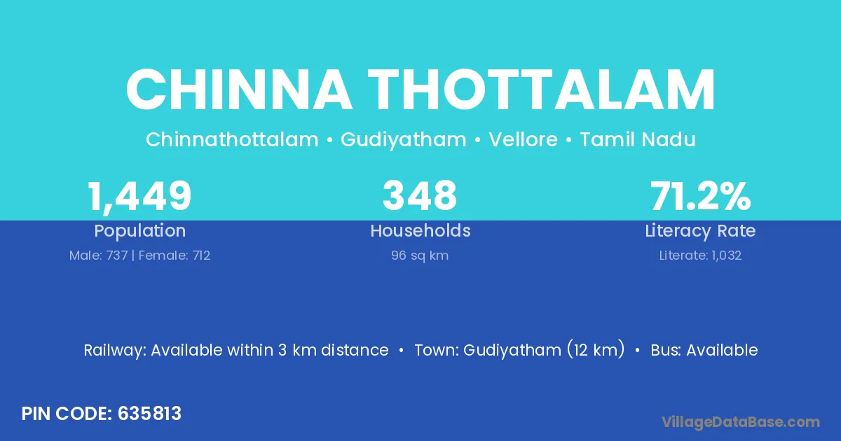 Gudiyatham (12 km) is the nearest town to Chinna Thottalam village for major economic activities and is located approximately 12 km away.