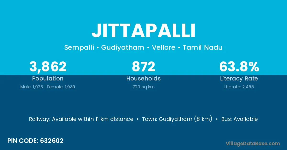 Gudiyatham (8 km) is the nearest town to Jittapalli village for major economic activities and is located approximately 8 km away.