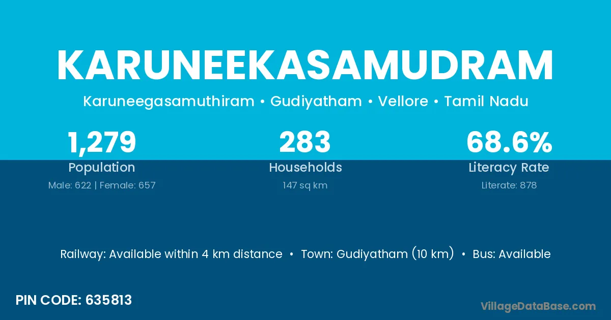 Gudiyatham (10 km) is the nearest town to Karuneekasamudram village for major economic activities and is located approximately 10 km away.