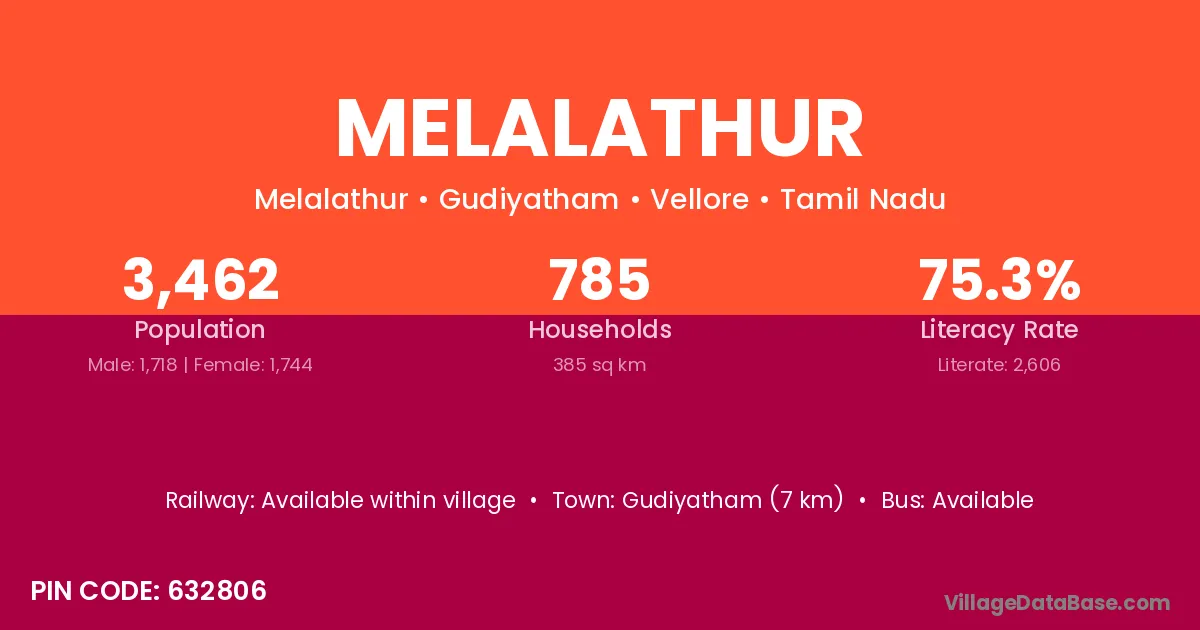 Gudiyatham (7 km) is the nearest town to Melalathur village for major economic activities and is located approximately 7 km away.