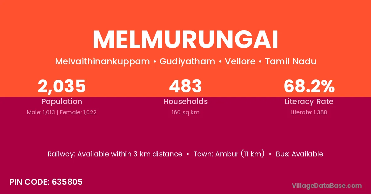 Ambur (11 km) is the nearest town to Melmurungai village for major economic activities and is located approximately 11 km away.