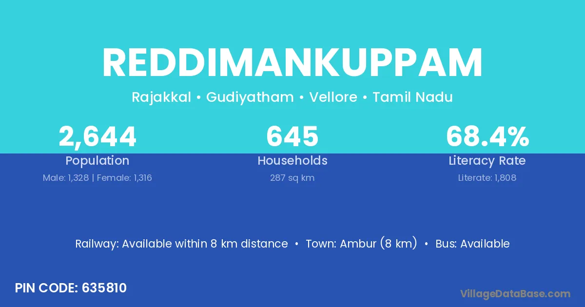Ambur (8 km) is the nearest town to Reddimankuppam village for major economic activities and is located approximately 8 km away.