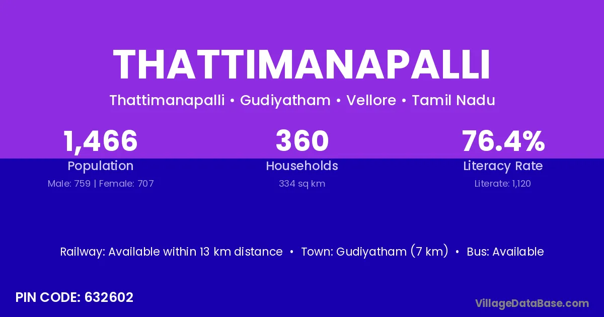 Gudiyatham (7 km) is the nearest town to Thattimanapalli village for major economic activities and is located approximately 7 km away.