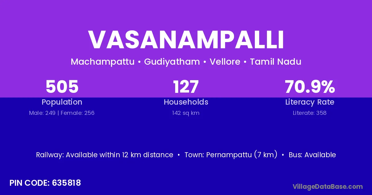 Pernampattu (7 km) is the nearest town to Vasanampalli village for major economic activities and is located approximately 7 km away.