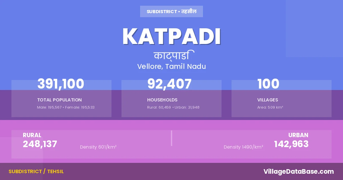 According to the 2011 census The total area of Katpadi Taluka is 509 km², with a population of 391100 people. The population density is 768 inhabitants per square kilometre, and there are approximately 92407 houses in the sub district.