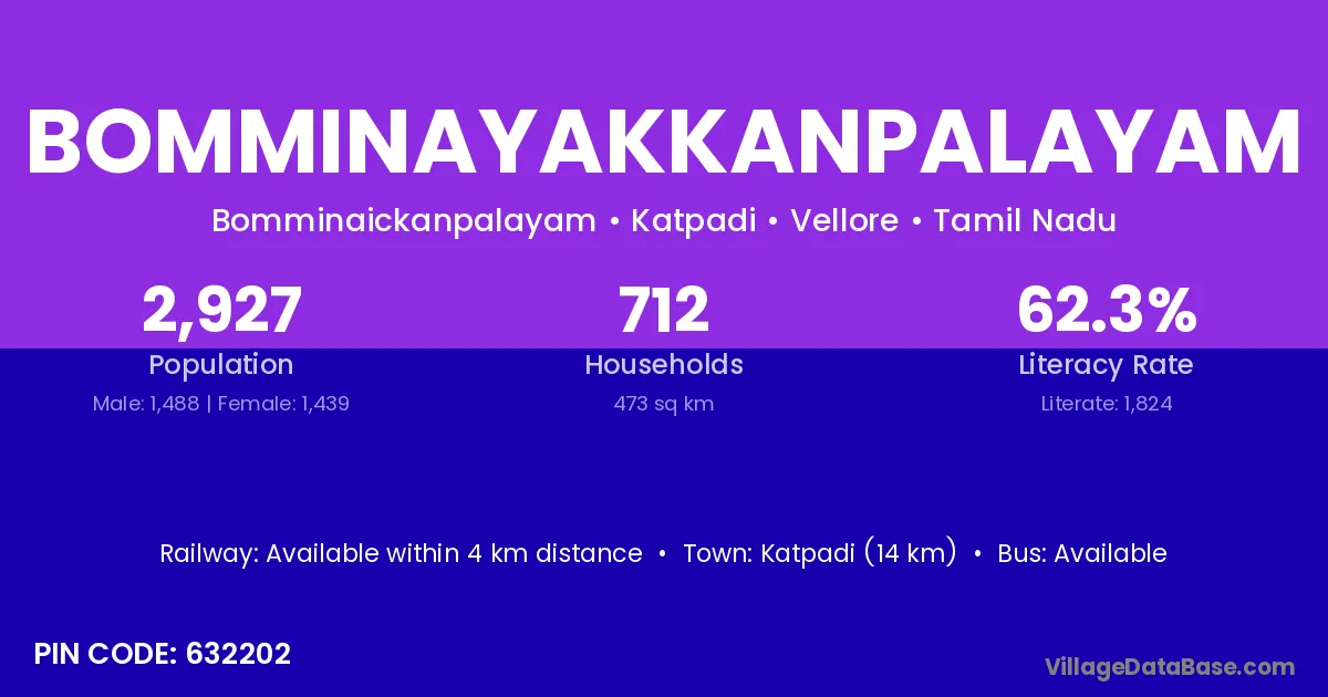 Katpadi (14 km) is the nearest town to Bomminayakkanpalayam village for major economic activities and is located approximately 14 km away.
