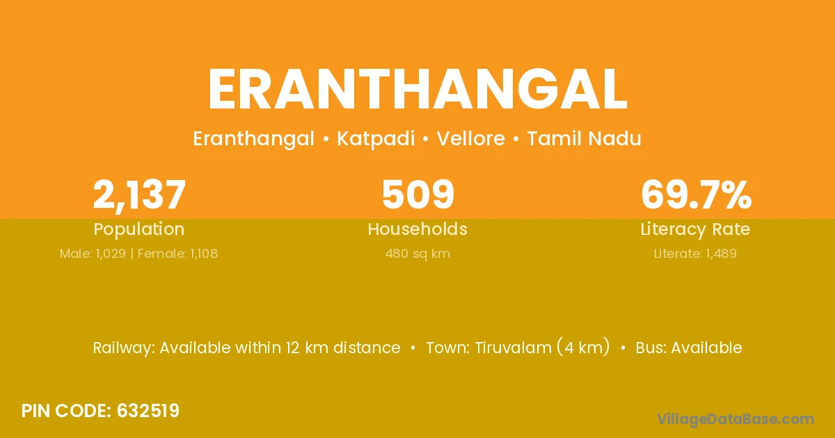 Tiruvalam (4 km) is the nearest town to Eranthangal village for major economic activities and is located approximately 4 km away.