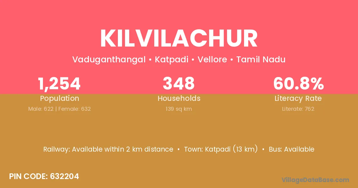 Katpadi (13 km) is the nearest town to Kilvilachur village for major economic activities and is located approximately 13 km away.