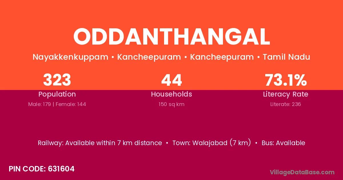 Katpadi (12 km) is the nearest town to Oddanthangal village for major economic activities and is located approximately 12 km away.
