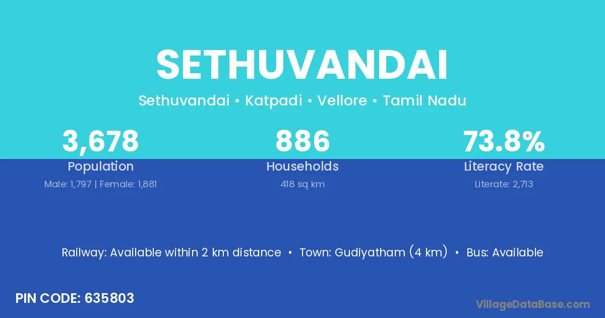 Gudiyatham (4 km) is the nearest town to Sethuvandai village for major economic activities and is located approximately 4 km away.