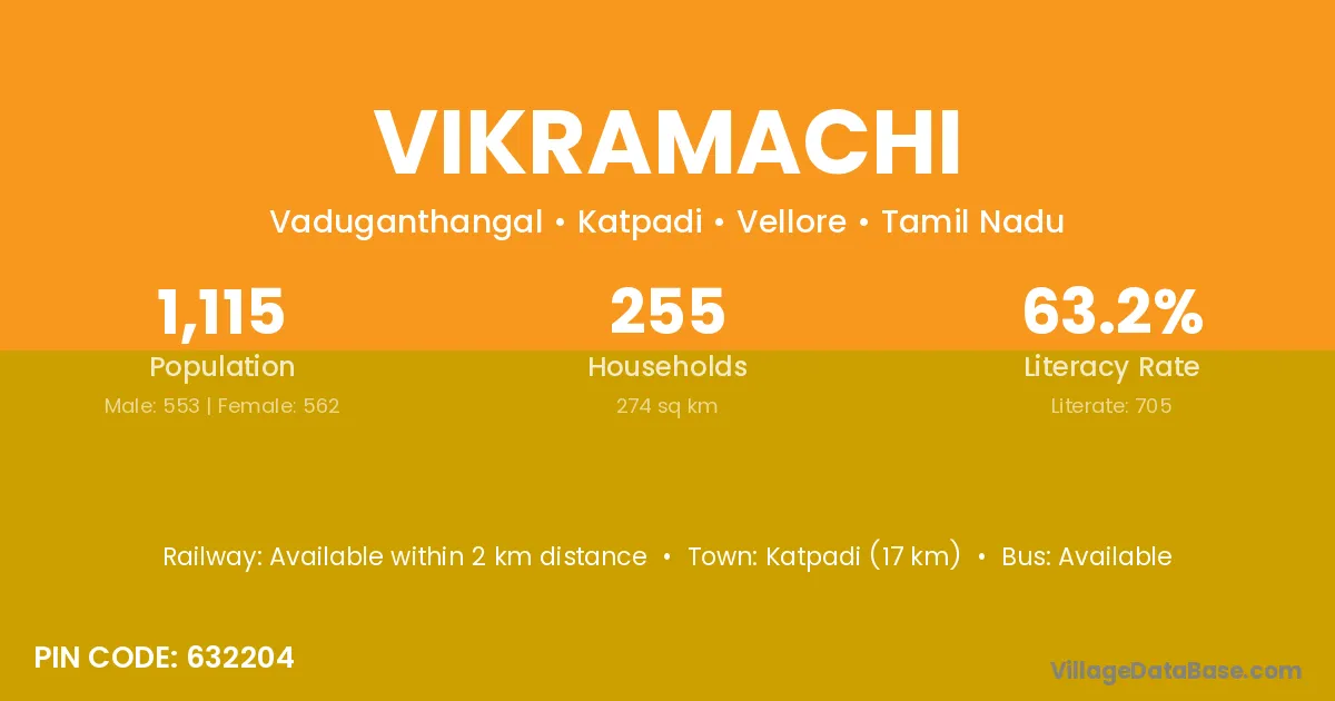 Katpadi (17 km) is the nearest town to Vikramachi village for major economic activities and is located approximately 17 km away.