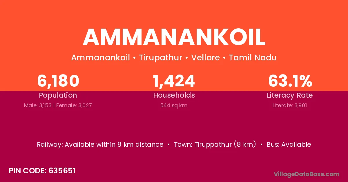 Tiruppathur (8 km) is the nearest town to Ammanankoil village for major economic activities and is located approximately 8 km away.