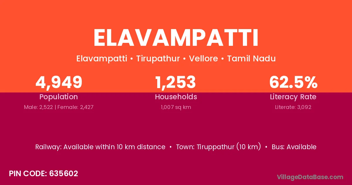 Tiruppathur (10 km) is the nearest town to Elavampatti village for major economic activities and is located approximately 10 km away.