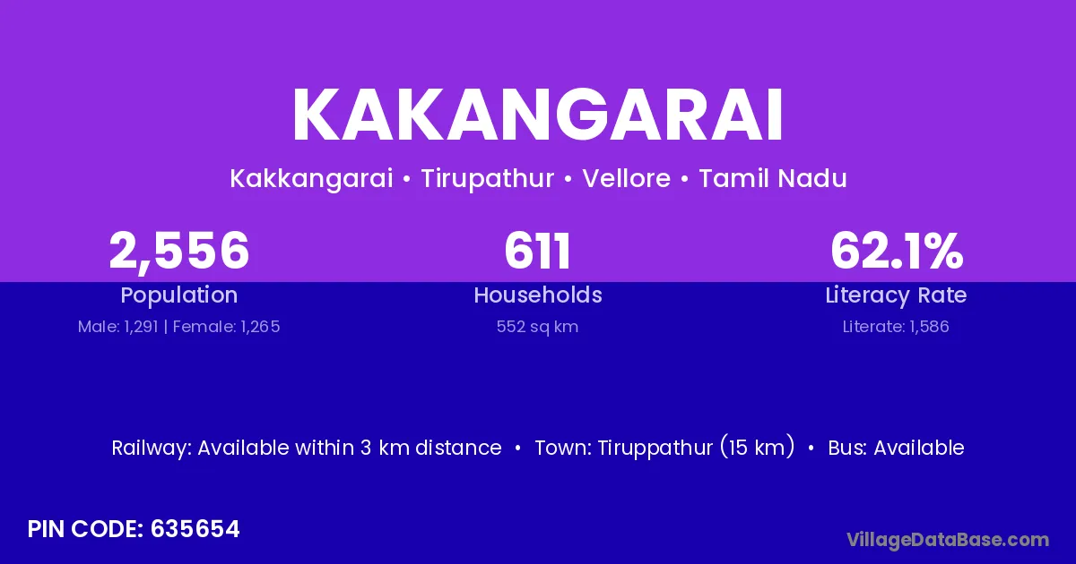 Tiruppathur (15 km) is the nearest town to Kakangarai village for major economic activities and is located approximately 15 km away.