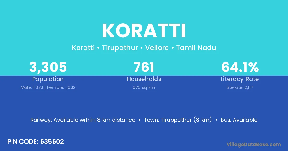 Tiruppathur (8 km) is the nearest town to Koratti village for major economic activities and is located approximately 8 km away.