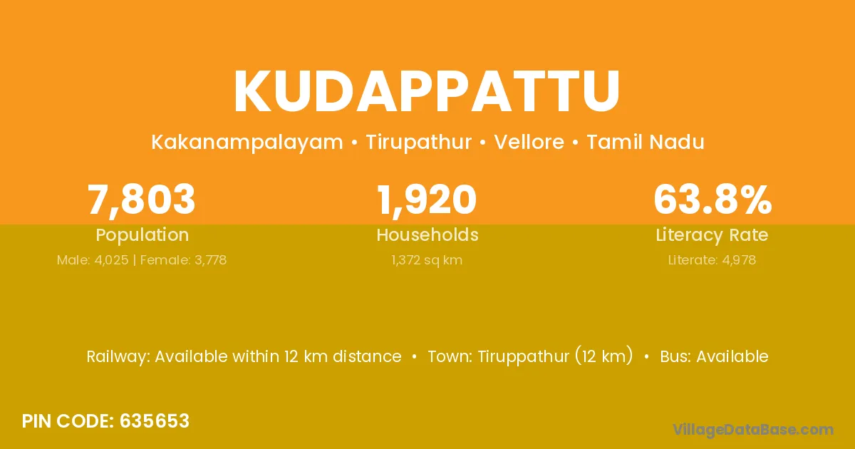 Tiruppathur (12 km) is the nearest town to Kudappattu village for major economic activities and is located approximately 12 km away.