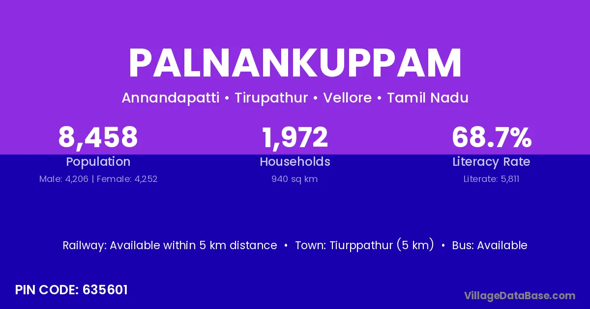 Palnankuppam village has a total population of 8,458 people, of which 4,206 are males and 4,252 are females.