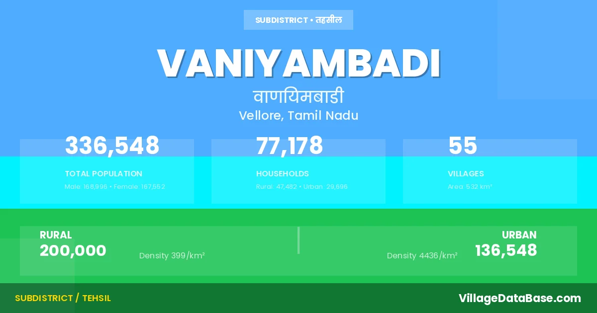 According to the 2011 census The total area of Vaniyambadi Taluka is 532 km², with a population of 336548 people. The population density is 632 inhabitants per square kilometre, and there are approximately 77178 houses in the sub district.