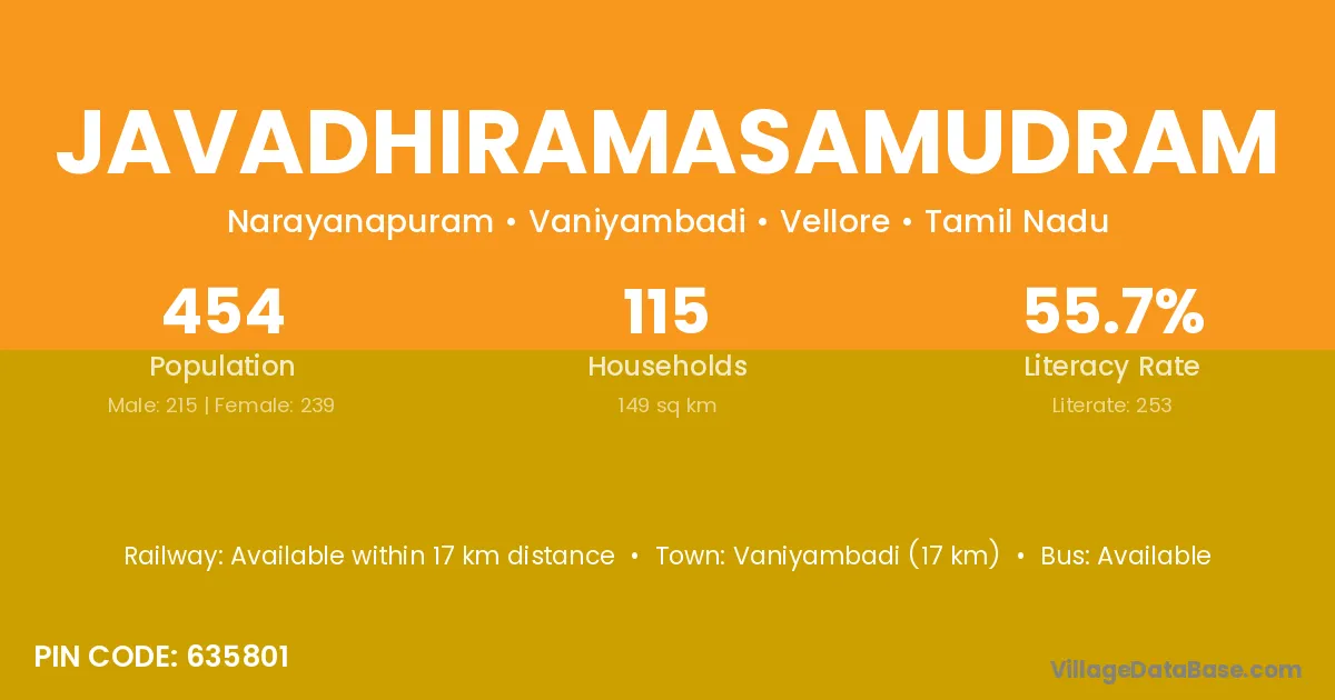 Vaniyambadi (17 km) is the nearest town to Javadhiramasamudram village for major economic activities and is located approximately 17 km away.
