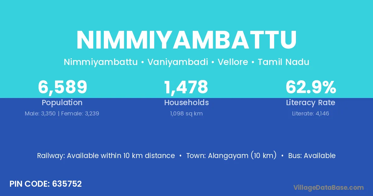 Nimmiyambattu village has a total population of 6,589 people, of which 3,350 are males and 3,239 are females.