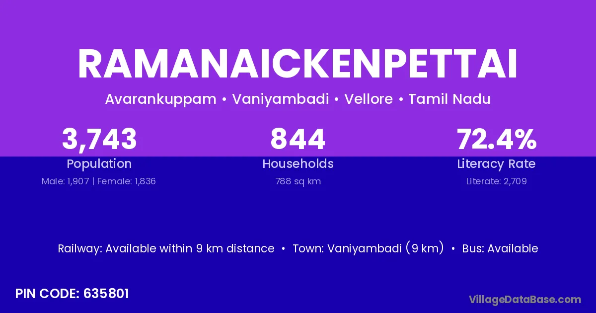Vaniyambadi (9 km) is the nearest town to Ramanaickenpettai village for major economic activities and is located approximately 9 km away.