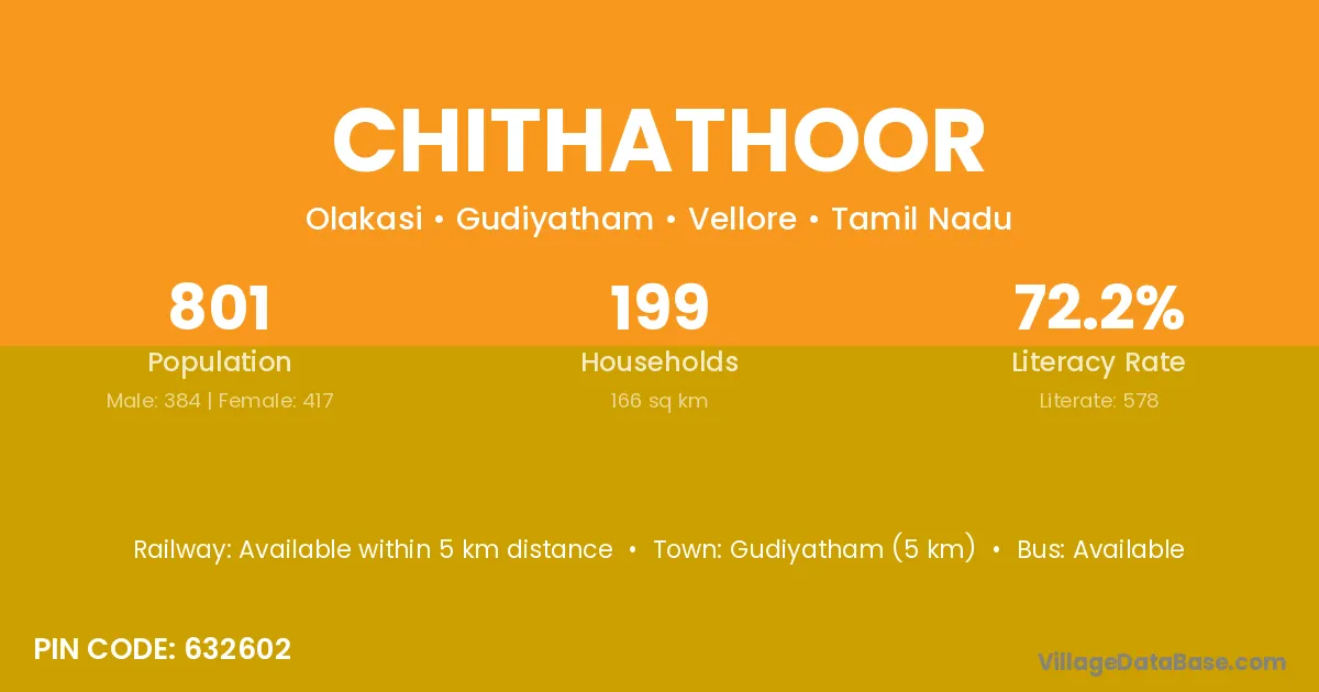 According to Census 2011 information, the village code of Chithathoor village is 632501.