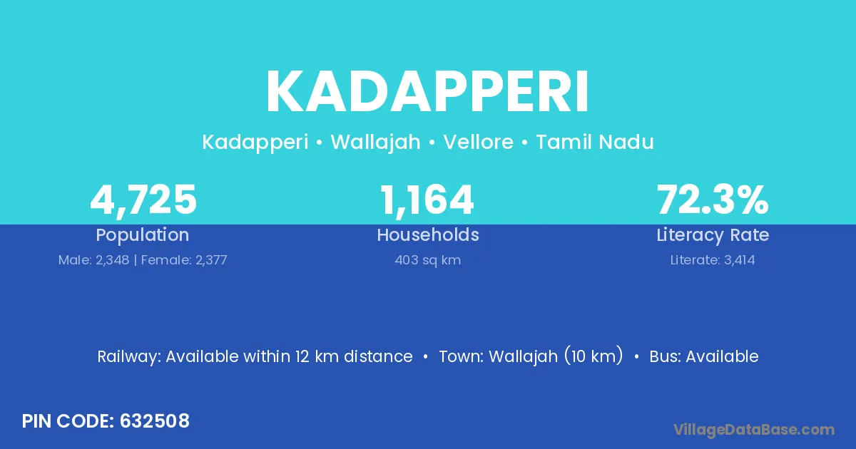 Wallajah (10 km) is the nearest town to Kadapperi village for major economic activities and is located approximately 10 km away.