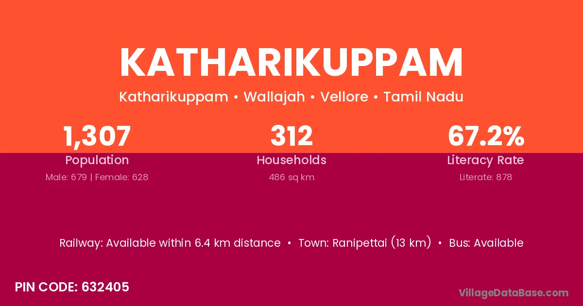Katharikuppam village has a total population of 1,307 people, of which 679 are males and 628 are females.