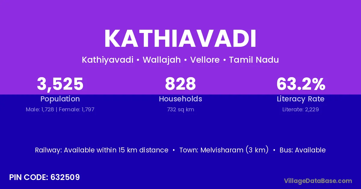 Melvisharam (3 km) is the nearest town to Kathiavadi village for major economic activities and is located approximately 3 km away.