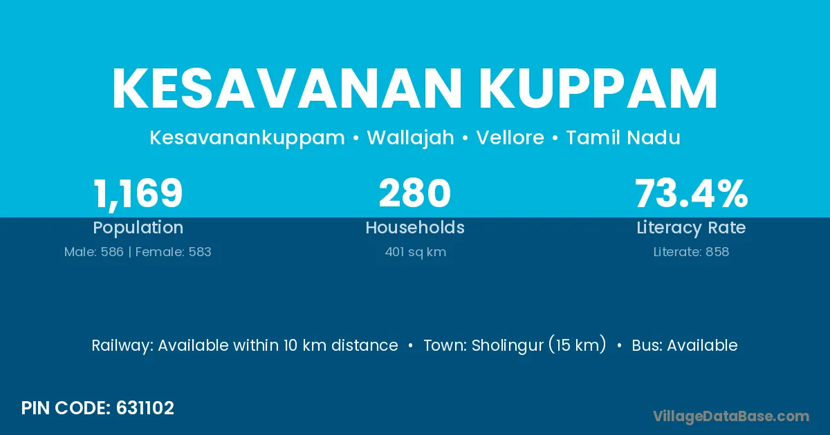Kesavanan Kuppam village has a total population of 1,169 people, of which 586 are males and 583 are females.