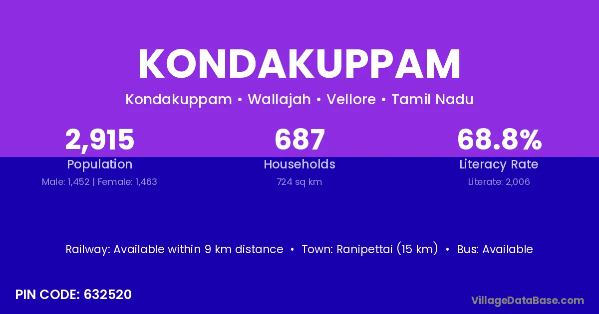 Ranipettai (15 km) is the nearest town to Kondakuppam village for major economic activities and is located approximately 15 km away.