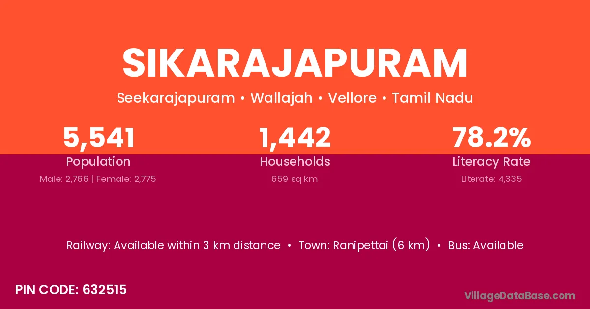 Ranipettai (6 km) is the nearest town to Sikarajapuram village for major economic activities and is located approximately 6 km away.