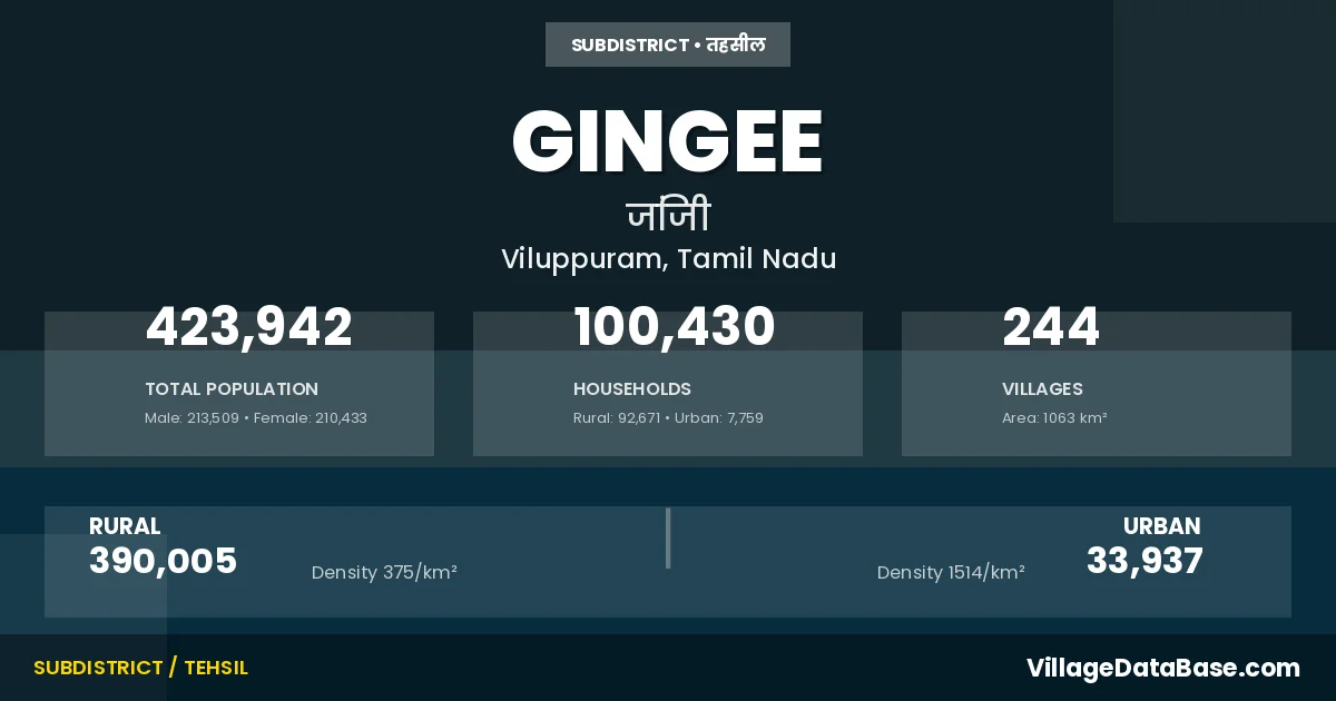 According to the 2011 census The total area of Gingee Taluka is 1063 km², with a population of 423942 people. The population density is 399 inhabitants per square kilometre, and there are approximately 100430 houses in the sub district.