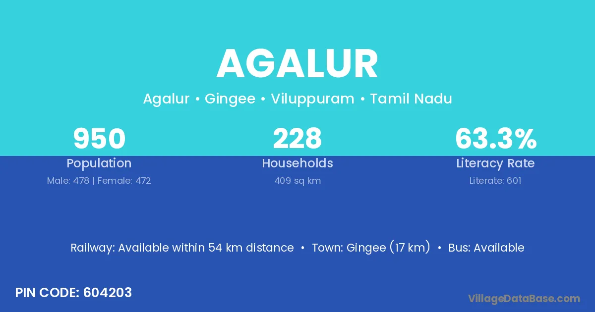 Agalur village has a total population of 950 people, of which 478 are males and 472 are females.