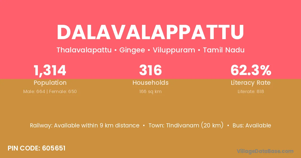 Dalavalappattu village has a total population of 1,314 people, of which 664 are males and 650 are females.