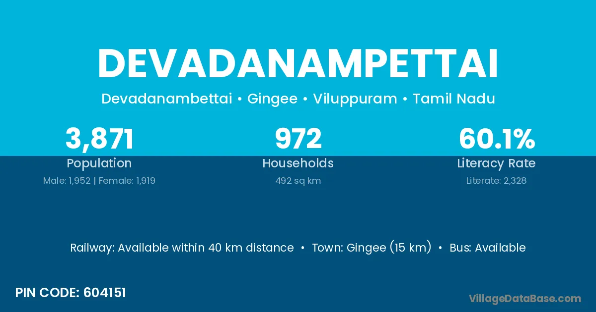 Gingee (15 km) is the nearest town to Devadanampettai village for major economic activities and is located approximately 15 km away.