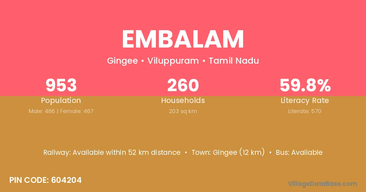 Embalam village has a total population of 953 people, of which 486 are males and 467 are females.