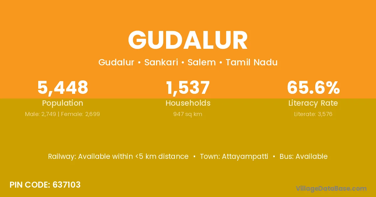 The literacy rate of Gudalur village is 61.69%. Male literacy stands at 72.85% and female literacy at 50.00%.