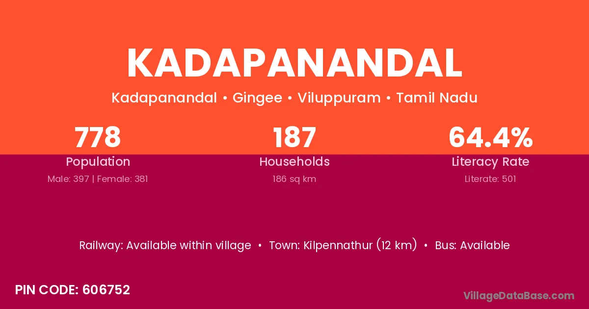 Kilpennathur (12 km) is the nearest town to Kadapanandal village for major economic activities and is located approximately 12 km away.