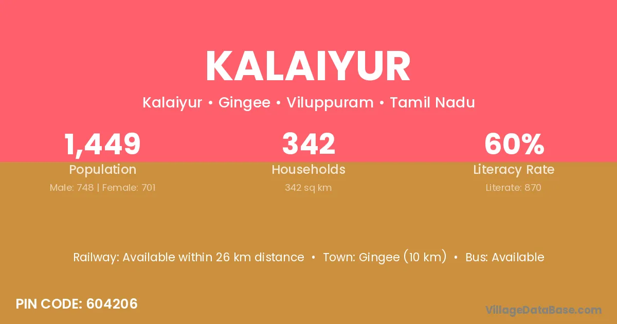 Kalaiyur village has a total population of 1,449 people, of which 748 are males and 701 are females.