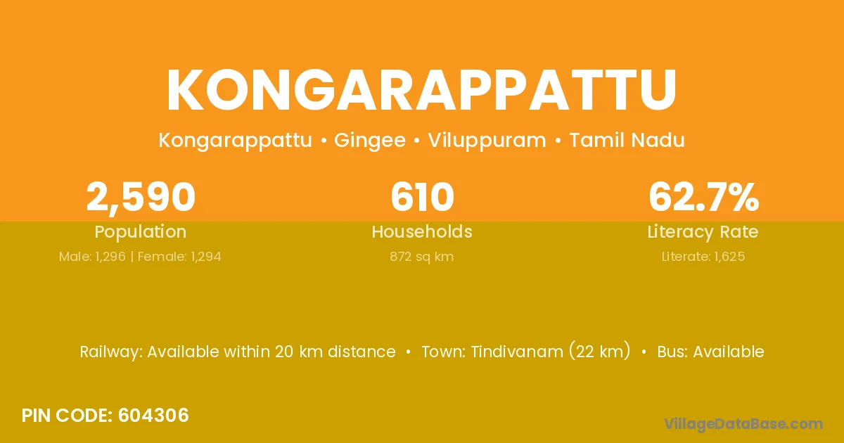 Tindivanam (22 km) is the nearest town to Kongarappattu village for major economic activities and is located approximately 22 km away.