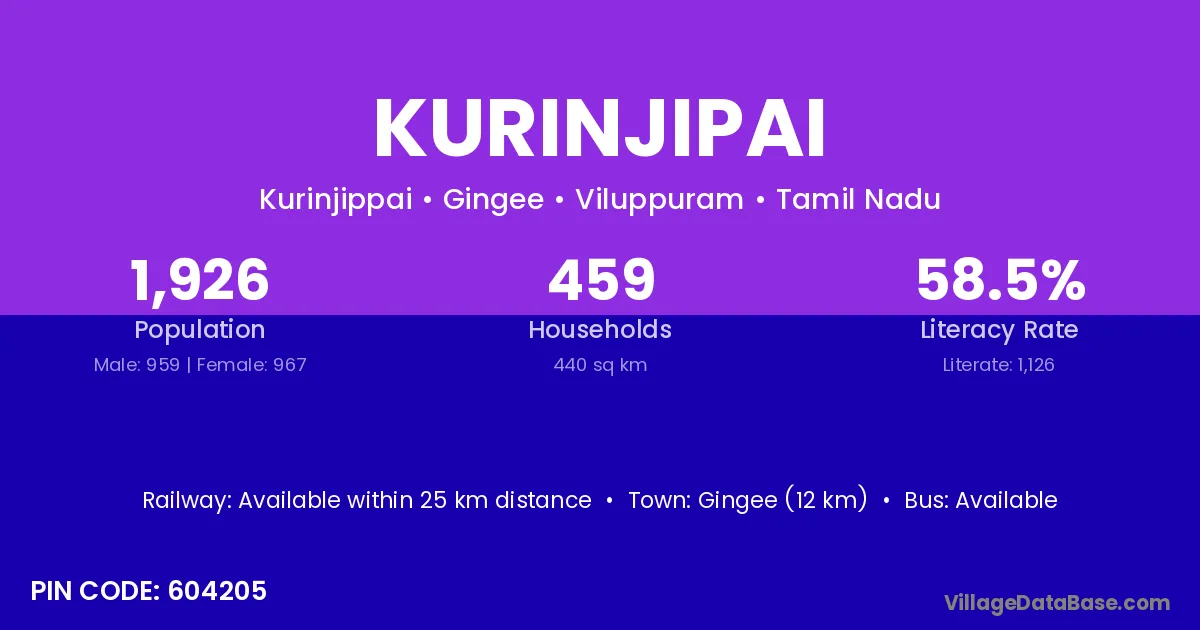 Kurinjipai village has a total population of 1,926 people, of which 959 are males and 967 are females.