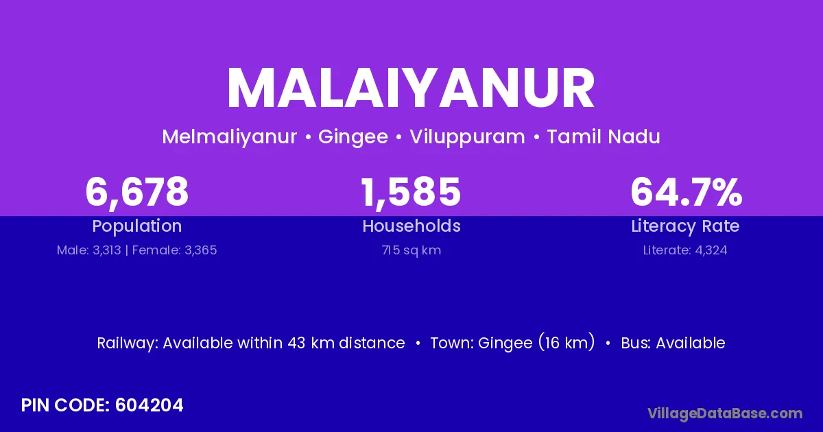 Gingee (16 km) is the nearest town to Malaiyanur village for major economic activities and is located approximately 16 km away.