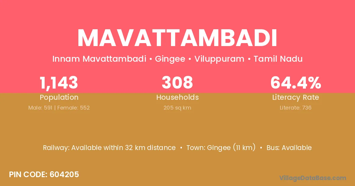 Gingee (11 km) is the nearest town to Mavattambadi village for major economic activities and is located approximately 11 km away.