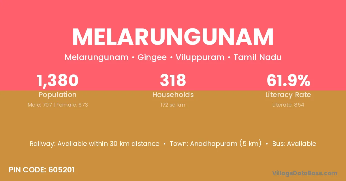 Melarungunam village has a total population of 1,380 people, of which 707 are males and 673 are females.