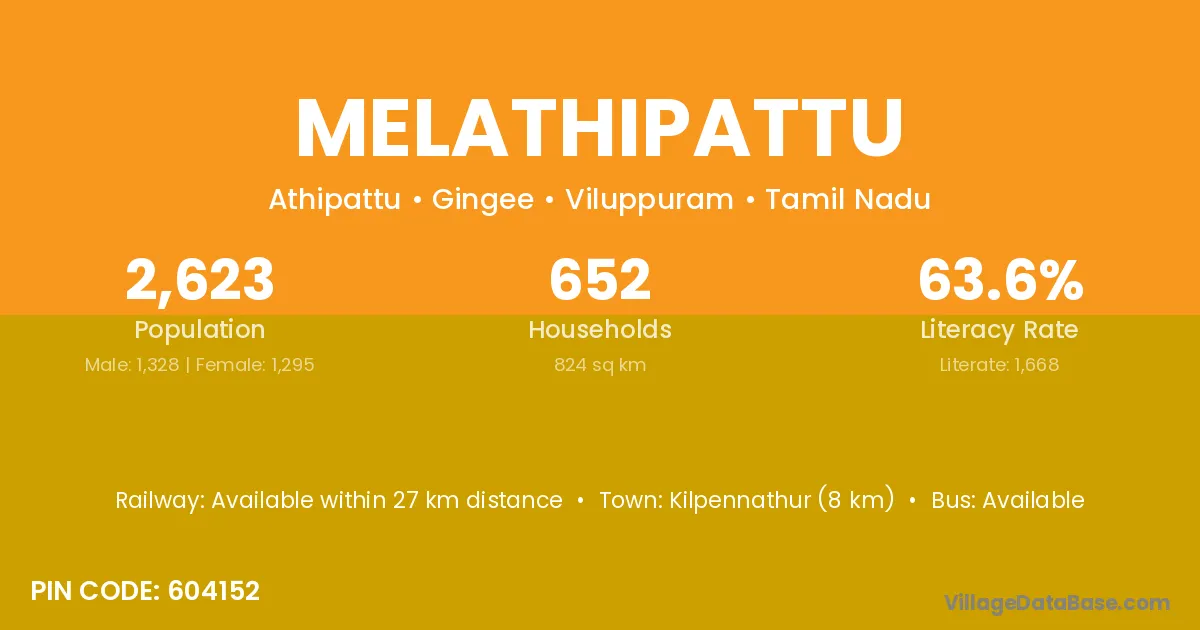 Kilpennathur (8 km) is the nearest town to Melathipattu village for major economic activities and is located approximately 8 km away.
