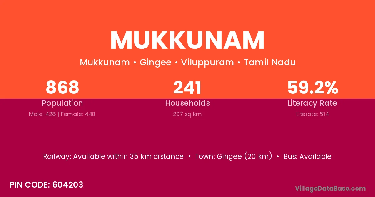 Gingee (20 km) is the nearest town to Mukkunam village for major economic activities and is located approximately 20 km away.